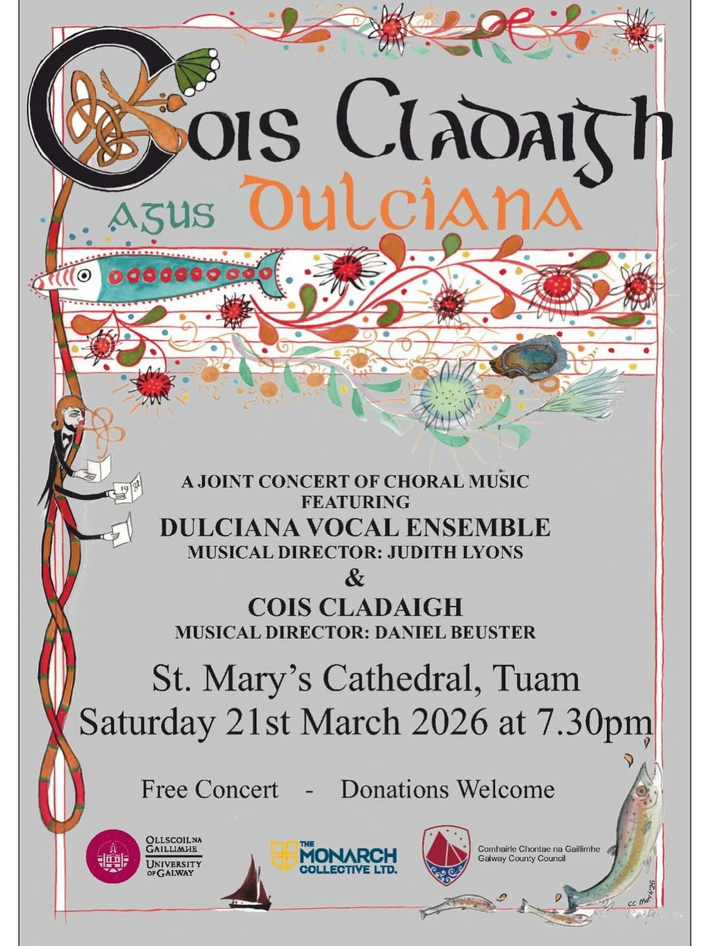 We’re delighted to tell you about our first upcoming concert of the year. We will be travelling to the beautiful Tuam in Co. Galway to perform with Cois Cladaigh on 21st March! Cois Cladaigh is a chamber choir, based in Galway and directed by Daniel Buester. Founded in 1982 by Dr. Brendan O’ Connor Cois Cladaigh has been part of the cultural fabric of Galway city for over 40 years. The choir specialises in European music from the Renaissance period and contemporary choral music of Irish and international living composers. This will be our first time performing in Galway and we’re really looking forward to connecting and collaborating with such a brilliant choir.